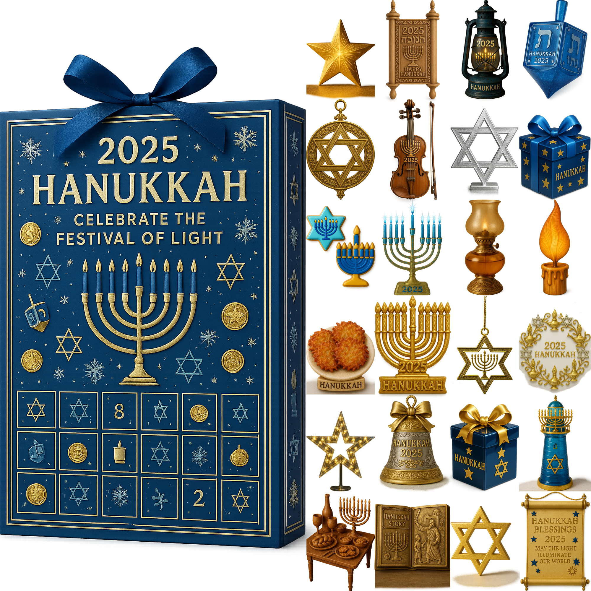 🎁This unique calendar includes 24 delightful surprises, each symbolizing the rich traditions of Hanukkah. From golden stars and menorahs to dreidels and gifts, each item is meticulously crafted to celebrate this special time of year.✨