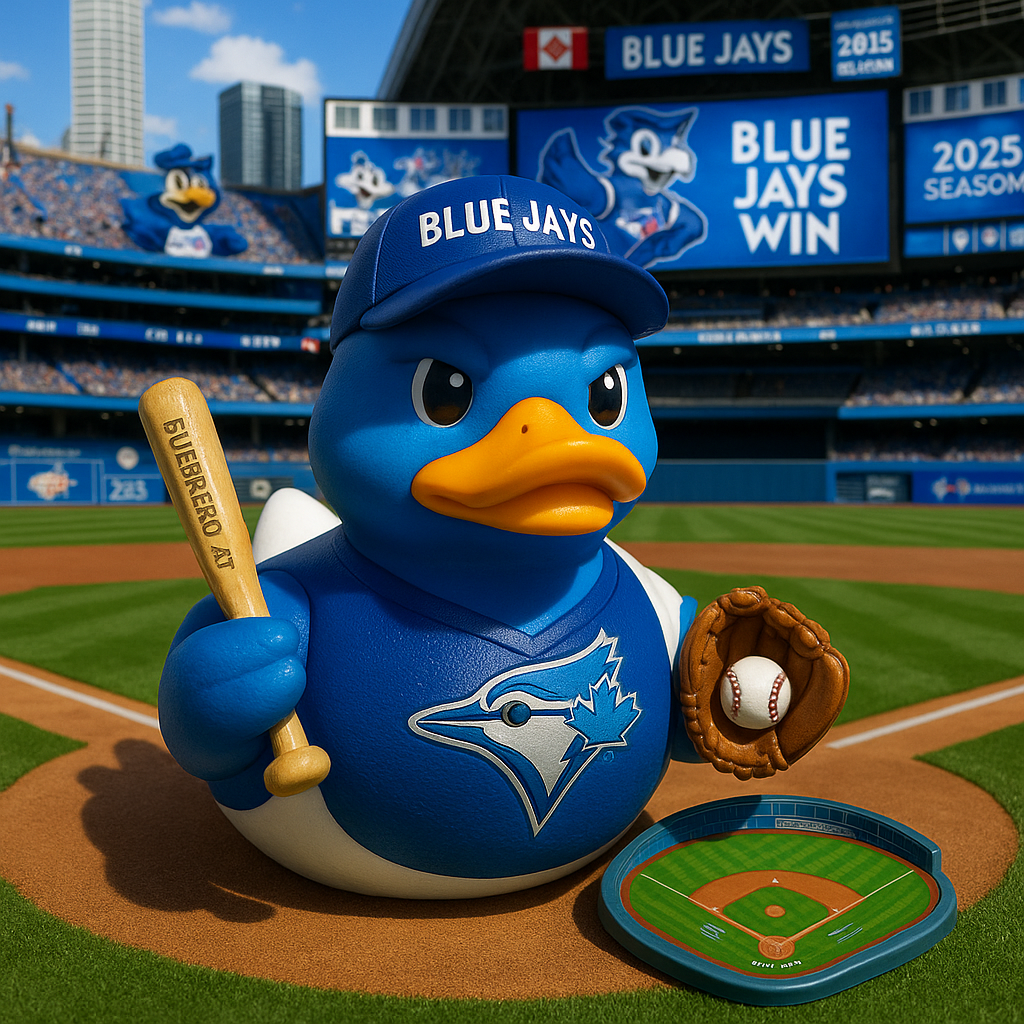 🎁This limited edition collectible features a fun and playful design with the duck dressed in Blue Jays gear, complete with a bat, baseball glove, and a miniature baseball field base.🎉
